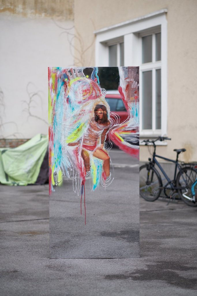 Mirror foil, silicone, pigment, collage